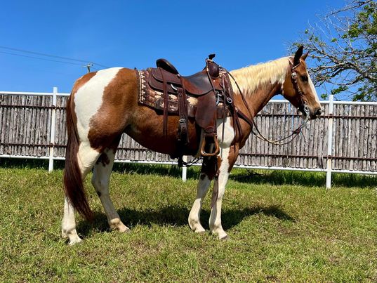 “Cynthia” is a 14.1H APHA red roan paint mare. Color or brains? Talented or easy going? Broke or gentle? Kid safe or handy for an advanced rider? Performance prospect or trail horse? The best part about Cynthia is you don’t have to choose. Someone is about to get a REALLY nice horse! You get absolutely everything with this mare! She’s bred exceptionally well, she’s SAFE, gentle, YOUNG, talented, GORGEOUS, has a nice handle on her, and she has real potential to make a performance horse in any direction! Cynthia was started and rode by a little girl for the last few years! That little girl wanted to move forward with a bigger head horse and that’s the only reason we have her now! This mare has seen it all! She’s already been in parades, dabbled in playday events, roped the sled and pushed cows. Cynthia has tons of talent and would make an awesome breakaway/heel horse or a barrel horse prospect! She has speed when asked and is super quick and catty when needed! But if all you want to do is walk the trails on a loose rein, she’ll do it flawlessly. Cynthia neck reins with ease and rides like one should. She moves off leg, goes exactly where you point her at the exact speed you ask, and she stops on a dime. We absolutely love this mare, if we had more time to add another personal horse, she absolutely would not leave. Riding Cynthia brings you a sense of peace and joy that not every horse emits. This mare has your back in all situations and acts like another member of your friend group. Take her to town and she’ll say hi to everyone before you get the chance to. Cynthia absolutely loves attention and has one of the best attitudes we’ve seen from a mare. She gets along with everyone and everything, loads, leads, bathes, ties and stands great. There isn’t one thing we don’t like about Cynthia and that’s why we’ve thought really hard about adding her to our personal pen. Sadly for us, we just don’t have the time and Cynthia deserves to go be someone’s #1! She’s the perfect age, perfect color, has the perfect attitude, is broke enough for any situation and has the talent to go in any direction. APHA incentives are becoming increasingly popular and are being added to more and more barrel racing and roping events. With Cynthia, you’re not only getting a GENTLE, solid mount to keep you safe through any situation, you’re also investing in a prospect that can earn you things your typical AQHA horse with these bloodlines can’t. You’re investing in an amazing pleasure riding horse, talented prospect and very well bred future broodmare. Cynthia is one that will be hard to duplicate and near impossible to replace. Writing this, we can’t help but have a sense of sadness that we won’t be the ones to enjoy her and her potential, but it brings us peace knowing someone else will soon feel the love we have for this mare. You won’t find another like her easily, and one that checks all the boxes like Cynthia does just may not exist with all the added bonus perks of her bloodlines and color. Cynthia is sure to bring joy to the lucky one that ends up with her and to whoever that may be or if it’s you, just know you’re getting one heck of a horse, and quite possibly THE horse of your lifetime. AFFORDABLE Shipping ANYWHERE easily available.