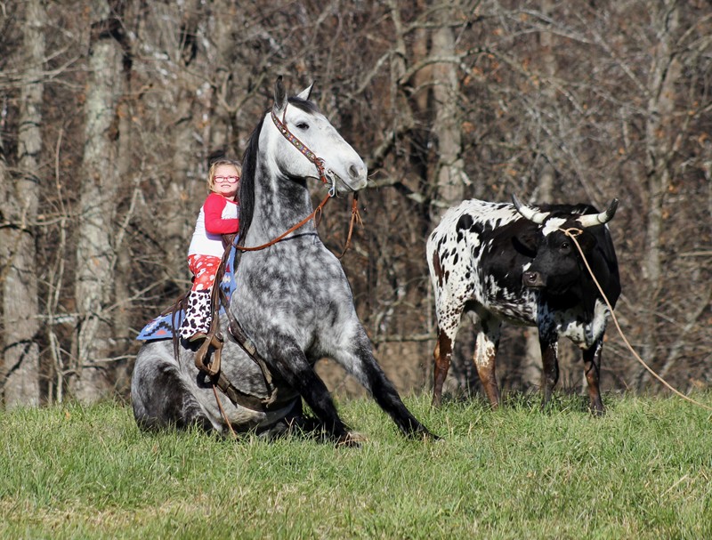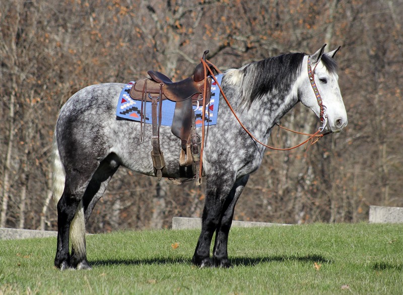 Amazing Diego is a VERY stout built Dapple Grey Crossbred Gelding, standing a solid 16.1hh, weighing 1400lbs and certainly is a once in a lifetime type horse! Diego is one of the horses that we put in and has now completed our natural horsemanship program. Diego has been in the program since early this year and he is trained to sidepass over to a mounting block, trailer fender, tree stump, ect…set on his rump, he will bow down, he is very good at laying down as well and loves to set on his rump. Diego is totally respectful on the ground as seen in the video, my 3 year old daughter can lead him anywhere with no worries of getting stepped on or pushed around. He will go halterless at liberty and follow, turn and back anywhere that you go even through the little small door on the front of the barn that’s only intended for people. Diego is a very gentle soul that is laid back and safe for any rider. I have used him for lessons with my 9 year old daughter so she could learn how to ride horses off of leg pressure without a bridle. We have ridden him double around the parking lot for hours, with horses going in every direction, loud speakers sounding off and hordes of people and kids running around. I have used him in the shovel race to drag a partner around the ring and also put him in the most wild and crazy setting possible The Balloon Pop where there is a balloon tied to each side of the horse and it’s a mad free for all as 25-30 riders run wild trying to pop each others balloons… and let me say NOTHING phases this him! He has done it all and seen it all! With Diego (as seen in our video) we have trail ridden him bridleless, literally hanging the bridle on a tree limb and heading off down the trails, over rocks, through tight spots, in/out of creeks ALL WITHOUT the use of any type of bit, halter, rein or neck aid. Diego will lope nice circles, take his leads, slide stop and back all too! Diego has a very soft and easy lope which is hard to find on a big horse! He is a very confident horse that is not spooky around anything or any situation and he is as close to bombproof as you’ll see. He has been used in all aspects of ranching from roping and dragging cows, to sorting and loading… he will stand his ground with unruly cows and keeps a cool head even in a heated situation! Diego has a very good handle, will spin both ways, sidepass, back, open and shut gates. Not only will he ride western he will also go English and has been started on jumps. In addition to riding english and western Diego will also hook up and pull a cart or buggy. He is safe in the chains and knows the shafts as well, single or double he does it all. He is safe to drive on the highway and isn’t scared of cars, trucks, mailboxes, garbage cans or barking dogs. As with all horses that complete our program, Diego loves attention in any form that he can get it whether that be brushing or bathing and has a ton of personality! He will follow you anywhere at you go at liberty and he is also easy to catch out of the pasture! He has been ridden around farm equipment, ATV’s, over large noisy tarps and has also had guns shot off of his back. No matter where he goes or what he does, Diego is not spooky acting. He has been exposed to all kinds of wildlife such as deer or turkey or other animals like cows or dogs and will go anywhere that he is asked too. He will go up or down even the steepest slopes, across deep creeks, over downed trees, and over all types of rough terrain while still being sure footed. Don’t miss this truly AMAZING horse!!!