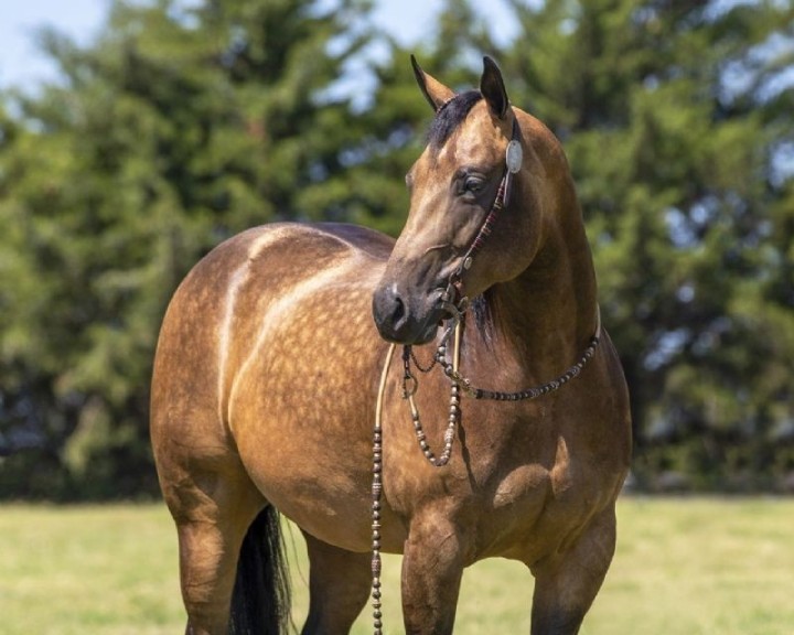 As Flamboyant and Fun as Vegas! This fancy showgirl has all the bells and whistles. Lucy is absolutely astonishing! She will definitely make you turn your head. Her flawless conformation, desirable buckskin color and elegant movement all wrapped up into one package! Anything you want to do horseback, here is your gal! Lucy runs a pretty reining pattern with easy lead changes, good speed control, fast spins and deep, long stops. She is extremely easy and push button. Back her in the box and some head steers! This mare can run, rate and turn some cattle. She is perfect in the box, leaves flat and has a fancy move in the corner. Very consistent and giving you the same shot every trip, she will work for any level of roper. She is extremely well rounded and nothing bothers her. She is safe and gentle even with extended time off. Lucy would make a great show horse for any level of rider and has been shown successfully by a youth kid. She is like having a nice, quiet using gelding around the barn with no “marish” tendencies. Her soft kind eyes, loving personality and sweet disposition make her a barn favorite. Lucy is hands down a great partner to do any task on the ranch or extremely competitive in multiple events in the arena such as team roping, ranch riding, Versatility and Reined Cowhorse. With her talent, looks, disposition and black-type pedigree you will have a magnificent future broodmare as well. She is 5 panel N/N.