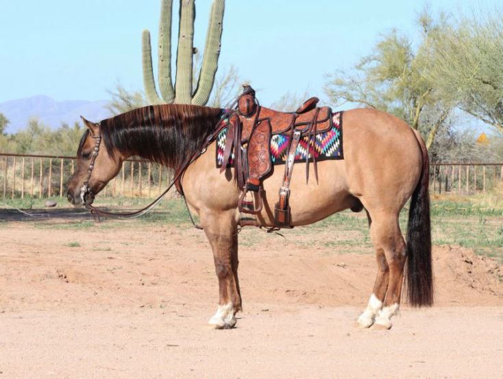 Peach is absolutely the most adorable gelding with a stout bulldog build, super fun color, large dorsal stripe down his back and tiger striped legs to his belly. Peach rides as good as he looks and is extremely versatile. He does everything! From reining, ranch work, cow work or just a fun, safe ride out on the trails this will be one that you will enjoy each and every ride. Always gentle, honest and easy going even with time off. Saddle him up and go enjoy! Peach easily performs all the reining maneuvers with long sliding stops, snappy spins and easy lead changes. He would be fun to show in the Ranch Riding and Versatility events. He has a super smooth jog and rocking chair lope. He has been ridden all over our Texas ranch as well as many miles in the Arizona. He is confident alone out on the trails and will go right where you point him. He is very sure footed and has a good outside walk. Peach is a very people friendly horse that loves any kind of attention making him super fun and easy to have around the barn. If you want to go show, pleasure ride, or both, Peach is a perfect fit and complete gentleman for any level of rider.