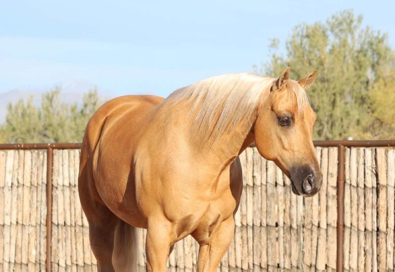 Colored up like golden coins and treasured even more is our handsome, saint of a gelding we all love, Rex. If you are in the hunt for a babysitter, confidence builder, and a tolerant packer here is your guy. You can look at his big, soft, kind eye and just tell he’s a good one! He will go as fast or slow as you want. He has pretty spins, balanced circles, great speed control, automatic lead changes and is a monster stopper. But if the arena isn’t your thing Rex is equally as great outside on the trails and all over the ranch. He’s happy to go wherever you point him and confident in all circumstances. Through the water, up the mountains, around the prickly cactus, down the busy roads, through the neighborhoods with bikes and strollers, nothing fazes him. Rex has the most forgiving and acceptable attitude. He would make a great first horse for beginners or kids to learn on, but has all the buttons and tools to be competitive and one you won’t outgrow. Rex is easy and push button to ride. He rides western, English, bareback and bridle-less. He’s super comfy with a sweet little jog and perfect slow lope. He collects nicely or will maintain the same speed on a draped rein. He’s going to be more of a push style horse, but trained and honest enough he doesn’t require spurs. He has beautiful lead departures with just a smooch and just say “whoa” and he will stop and stand like a wooden Indian. He will lay down to mount or dismount, stand quietly at a mounting block, or scoot over next to a fence. Rex has an A+ disposition and is 110% a gentleman all the way around. Never rude or pushy, just a sweet laid back teddy bear that enjoys attention, grooming, bathes and loving. Rex is the total package bound together with that sought after palomino color, prime age of 7 years old, black type pedigree, talent and ability, and the mind and disposition of a winner. He is a great size standing 14.3 hands with balanced and correct conformation. Rex is a champion in our barn and in our hearts. He’s a special kind of horse that deserves the best forever home.