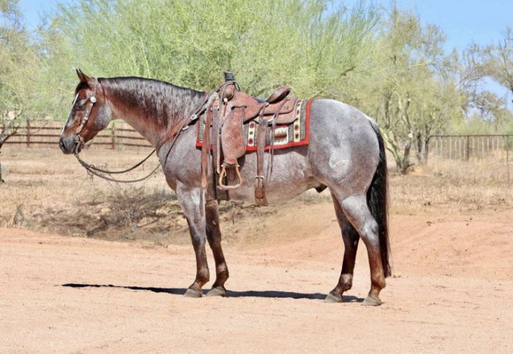 You will be looking pretty dapper showing up with this astonishing roan gelding! I would refer to Sahara as a “ride in luxury”. They just don’t come much fancier! With his soft, kind eye, versatile talent, and willing temperament, Sahara resembles his sire (leading Cutting & Reined Cowhorse Sire with offspring earnings of $18 million+). Aside from his swagger looks, Sahara is an extremely well-trained all-around gelding. He’s a one-stop shop, if all you have is a one-horse trailer. Sahara will run a reining pattern, cut a cow, rope in and out of the arena, cruise down the trail, or go do any ranch job and he takes it all in stride. He is a gorgeous mover and looks like a boss in the showpen. His presence is bold and you can’t walk by him without taking a second look. He performs all of the reining and ranch riding maneuvers very easily with super easy lead changes, smooth sliding stops, pretty spins, good direction, and a big long trot. If horse show is your cup of tea, here’s one that will make a statement. He has Ranch Versatility, Ranch Riding and Cowhorse stamped all over him. Sahara loves cow work, whether you are on the ranch or in the arena, he looks forward to it. He has a big heart and will give it all to you every time. He is very cow smart and reads one like a book. Just point and go, he will do the rest. Sahara has been pasture roped on, steer stopped out of the head box, and roped the sled a ton. He would make a jam up breakaway, calf or heel horse. Sahara is always gentle and safe for any level of rider. If you just want to occasionally hit the trails or go extreme cross country, he is always a great partner. He is confident alone and quiet in a group. You can ride him once a month and he will be the same way you left him the previous ride. He stays trained, kind and quiet. Sahara loves people and will meet you at the gate everyday eagerly waiting attention. His sweet, loving and inquisitive personality will make you laugh and fall in love over and over. Sahara fills the bill and will satisfy the demands and requirements of the most meticulous buyers. Sahara is the whole nine yards with his classy looks, vibrant color, flawless conformation, black-type pedigree and the talent and ability to do anything horseback.