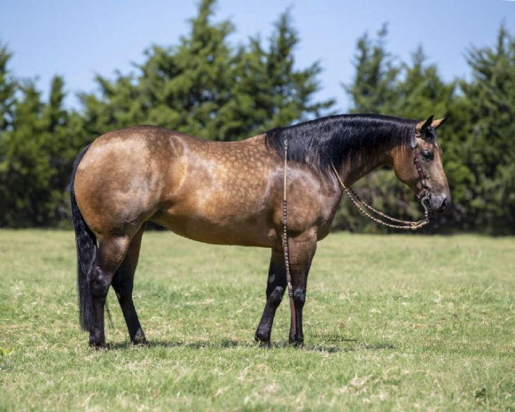 As Flamboyant and Fun as Vegas! This fancy showgirl has all the bells and whistles. Sandy is absolutely astonishing! She will definitely make you turn your head. Her flawless conformation, desirable buckskin color and elegant movement all wrapped up into one package! Anything you want to do horseback, here is your gal! Sandy runs a pretty reining pattern with easy lead changes, good speed control, fast spins and deep, long stops. She is extremely easy and push button. Back her in the box and some head steers! This mare can run, rate and turn some cattle. She is perfect in the box, leaves flat and has a fancy move in the corner. Very consistent and giving you the same shot every trip, she will work for any level of roper. She is extremely well rounded and nothing bothers her. She is safe and gentle even with extended time off. Sandy would make a great show horse for any level of rider and has been shown successfully by a youth kid. She is like having a nice, quiet using gelding around the barn with no “marish” tendencies. Her soft kind eyes, loving personality and sweet disposition make her a barn favorite. Sandy is hands down a great partner to do any task on the ranch or extremely competitive in multiple events in the arena such as team roping, ranch riding, Versatility and Reined Cowhorse. With her talent, looks, disposition and black-type pedigree you will have a magnificent future broodmare as well. She is 5 panel N/N.
