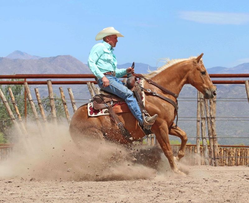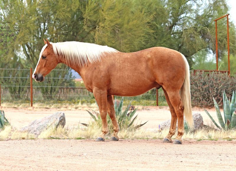 Golden and Gorgeous! Snickers makes a statement everywhere he goes! Not only is he stunning, but he checks all the other boxes too! Safe, safe, safe every time you catch him. Snickers is super easy going and wants to always be a good boy. Gentle and easy to handle in the saddle and on the ground. Fully trained in the reining with stylish spins, easy lead changes, and long sliding stops. His speed control is amazing and is more of a push-to-go type of horse, but so trained he easily takes his correct leads with just a smooch and neck reins with the lightest touch. When you say “whoa” all four feet are like a statue. Snickers is great out on the ranch. He is naturally cowy and good in the sorting pens and gathering cattle out of big pastures. He ground ties where you drop a rein, side passes to all the gates and can pull a semi truck if you roped it. Snickers is a trooper out on the trails and is confident alone, will lead a group, or happily trail behind. He goes where you point him and doesn’t say no. He’s accustomed to lots of wild life, crazy dogs, pigs, camels, buffalo, and cattle. Blowing tarps, loud gunfire, busy traffic and heavy machinery do not phase him either. Snickers has a big personality and is a fun horse to have around the barn. He’s the kind that anyone will be proud to own.