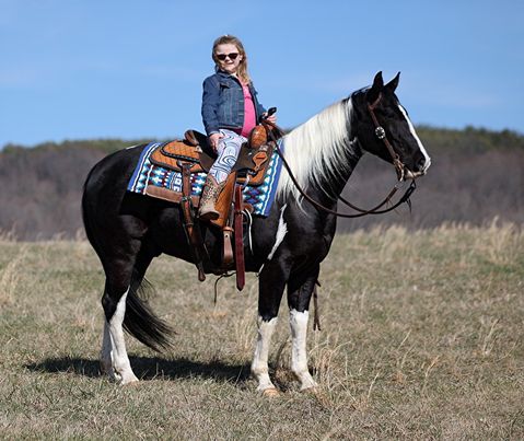 Vandam is a SUPER stocky built gelding standing 14.2hh and is a beautiful Black/White Paint. He is registered APHA and his pedigree has some of the best you will find!!!! He is bred to do anything that involves a cow! Vandam has a lot of experience and has been ridden lots of miles. He has been owned and ridden by a good friend of ours who is a natural horsemanship trainer. Vandam will lay down and set on his rump. He also rides bridleless, you MUST SEE his video!!! He is a super sweet horse and loves attention! He is a horse that the whole family can ride and love regardless of what age they are! He is stout enough to carry a big ol daddy yet gentle enough to his carry baby girl! I have hauled him to team sorting events and won money on him, he has been started on both ends of the roping dummy and has huge potential! He has been trail ridden in several states. He will cross creeks, ditches, logs and navigate rough rocky areas. He is safe riding in traffic. He has a smooth jog, a nice lope, will slide stop, turns a circle both ways, sidepasses and backs with ease! He a confident horse on the trails and will lead the crew, head out alone or follow behind with no issues! He has been exposed to all kinds of wildlife such as deer or turkey or other animals like cows or dogs and will go anywhere that he is asked too. He has been rode many miles in the mountains and encountered every obstacle possible on the trail. He will go up or down even the steepest slopes, across deep creeks, over downed trees, and over all types of rough terrain while still being sure footed. Vandam is not cinchy, cold backed, does not crib or weave. If you’re looking for a family horse, ranch horse, rope horse, team sorter… Vandam is one horse that can do all those jobs!
