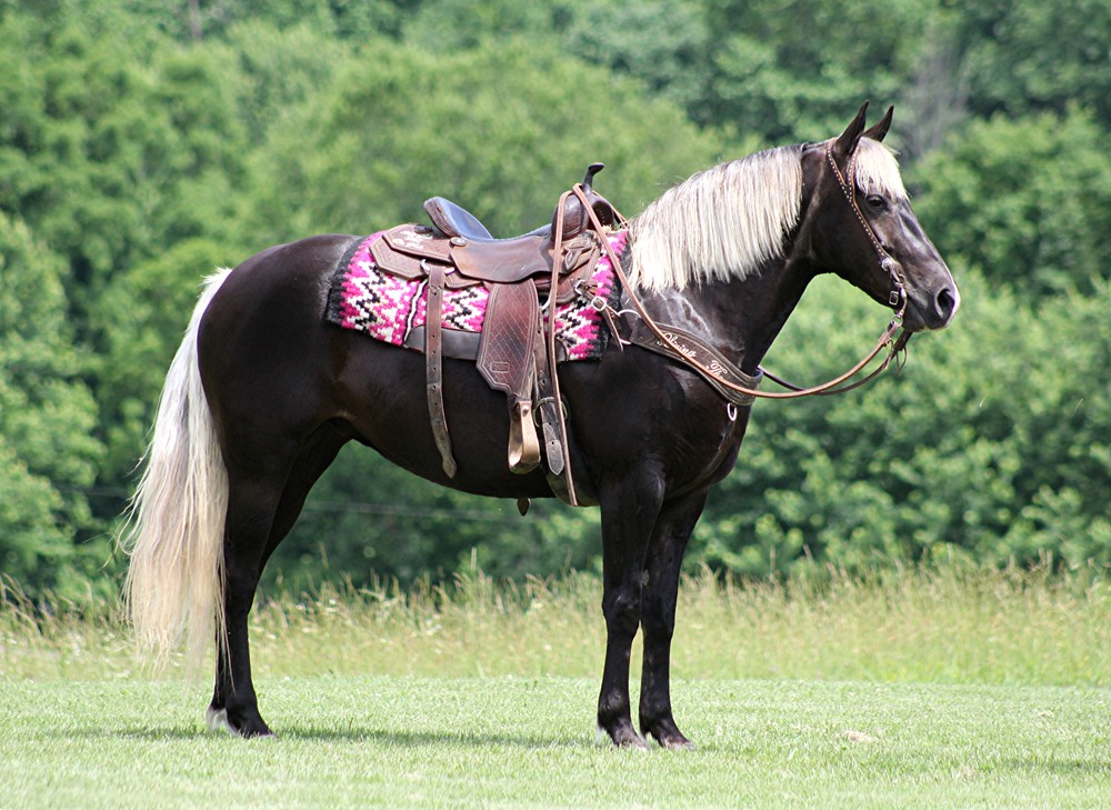 Winnie is a super stout built, Rocky Mountain Mare, standing 15.1hh, is that classic dark chocolate color with a platinum blonde mane and tail! She is built like a tank, built to carry a heavy load but gentle enough to carry the precious cargo! She has miles and miles of experience! Winnie has been camping and trail ridden at large campgrounds and has been on week long camping trips. She is easy for me to catch, clip, bath, tack-up, load, and handle. She has a natural smooth 4-beat gait that covers the ground with ease. No matter where she goes or what she does, Winnie is not spooky acting and on the trails she is always great! She will ride anywhere that she is asked whether that be in the front or back of the group. She is confident and leave the barn or other horses with no issues. She has been exposed to all kinds of wildlife such as deer or turkey or other animals like cows or dogs and will go anywhere that she is asked too. She has been rode many miles in the mountains and encountered every obstacle possible on the trail. She will go up or down even the steepest slopes, across deep creeks, over downed trees, and over all types of rough terrain while still being sure footed. She has been rode in traffic, and is very traffic safe around cars, semi, log, and dump trucks. She has a great personality and a great attitude about whatever she is asked to do.