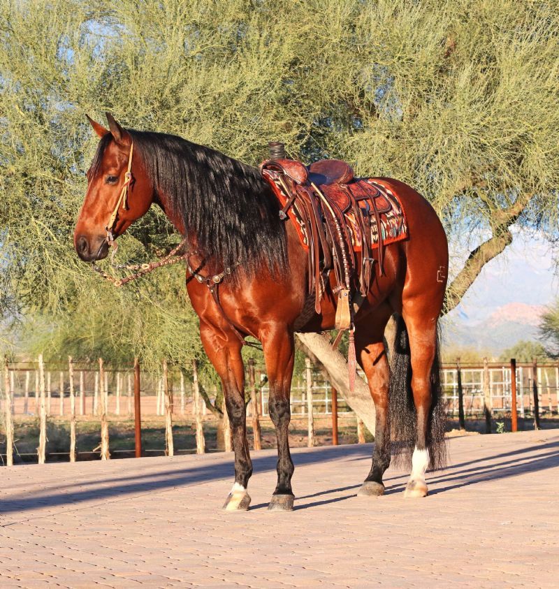Yankee is not only tall, dark, and handsome, but has impeccable manners and the sweetest personality. He’s the kind that everyone wants to take home and call theirs. Standing 15.3 hands, gorgeous blood bay with a super long mane and tail, this gelding will get attention every step he takes. Yankee is quite versatile with a pretty big resume.He has quite the accomplishments, buckles and ribbons! Yankee has a very elegant and classy style and I believe he would excel in western dressage. He also looks unbelievable in an English saddle. He is an excellent mover with a magnificent long trot, slow and smooth jog, and a rocking chair lope that you could ride all day. In or out of the arena, this guy handles the trail course flawlessly. Yankee is crosses logs, bridges, and jumps. He willingly side passes to to the gates and ground ties where you drop a rein. We have roped cattle on him and used him all over our ranch. He’s a kind soul that wants to be your best partner. Yankee is 100% gentle, tolerant, and kind for a beginner, kid, or great grandma. He’s a great confidence builder that knows the ropes. He stays gentle with time off and is the same sweet and honest boy every time you saddle him. Absolutely no silly business. Yankee trail rides like a dream and is confident alone or good in group. He’s a happy camper in all situations. He will cross running water, deep mud, thick brush, navigate through prickly cactus, and has seen lots of different terrain. Yankee loves attention and is easy peasy to catch in the pasture. He will walk right up to you and follow you around. He’s great with other horses in the pasture and side by side in a stock trailer. He will stand tied patiently for hours and is always respective of people and all animals. Yankee knows some fun tricks and will lay down with a touch of the finger and pick up your rope or hat from the ground. He’s accustomed to crazy dogs, heavy traffic, loud gunfire, large machinery and blowing tarps. Yankee is going to make someone amazing and we are proud to offer this phenomenal gelding. He ticks all those boxes with his stellar looks, a gentle demeanor, blacktype pedigree and a huge performance record! Just like Yankee, we absolutely adored him. Good bloodlines produce solid minded, trainable, and good horses!